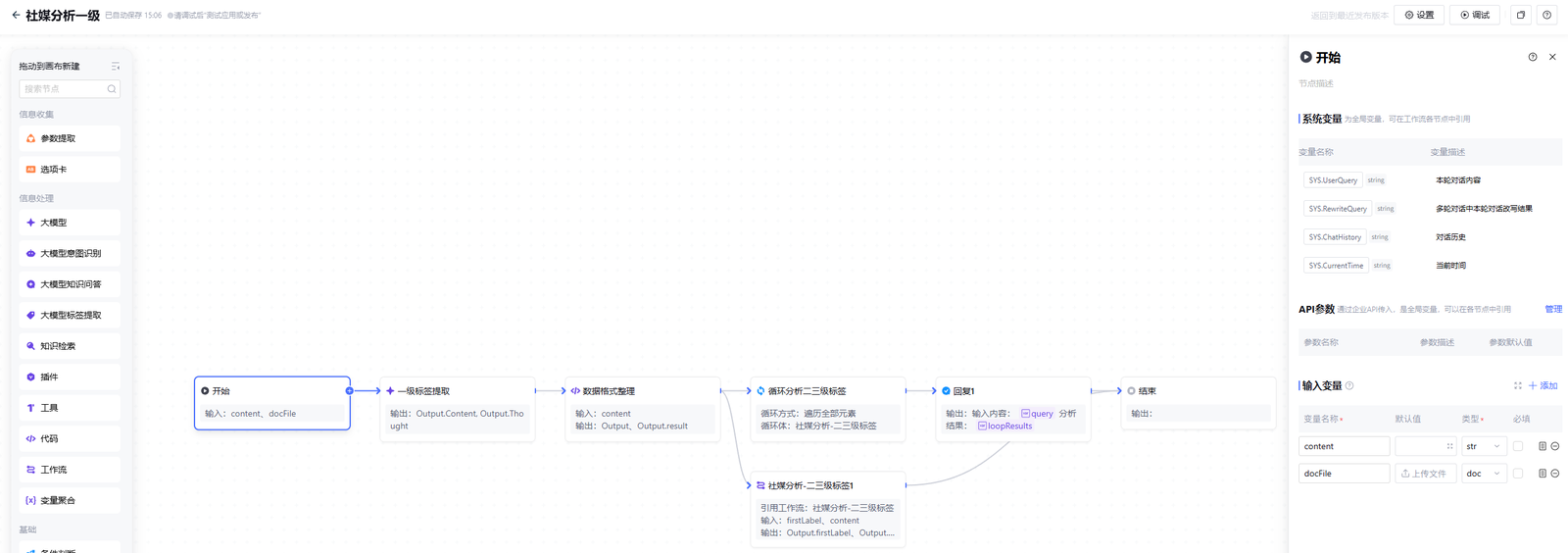 父工作流"社媒分析一级"需要调用子工作流"社媒分析二三级"。子工作流的开始节点设置接受内部输入内容或传入文件的输入变量。
