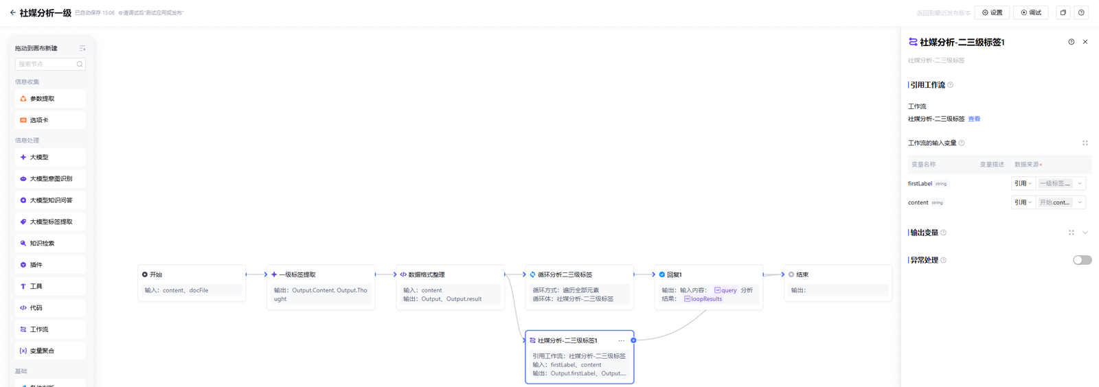 运行过程中,将"社媒分析一级"父工作流中的"一级标签"和用户输入内容作为子工作流"社媒分析二三级"的输入。运行过程中,"社媒分析一级"父工作流中可以使用"社媒分析二三级"子工作流的输出。