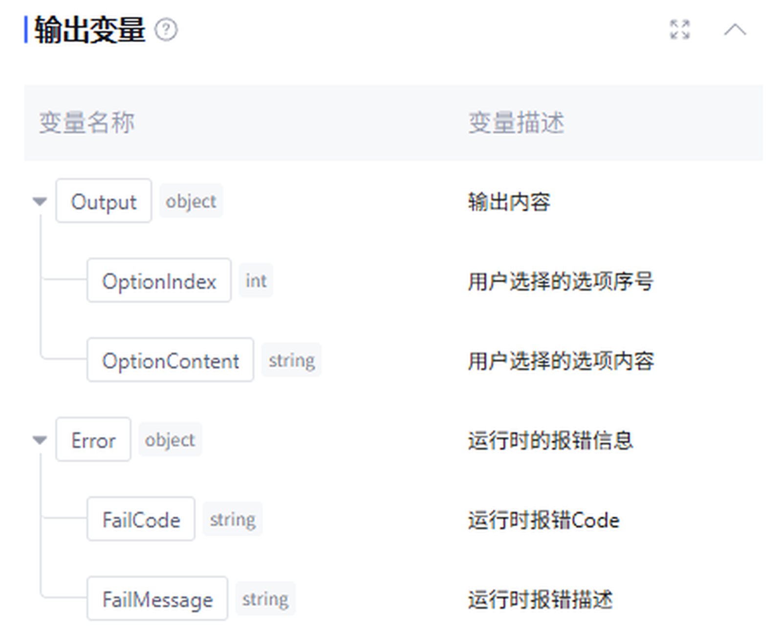 经该节点处理后的输出变量,默认包含用户选择的选项序号和选项内容两个变量,以及运行时报错信息 Error(数据类型为 object,正常运行时该字段为空)。不支持用户手动新增。