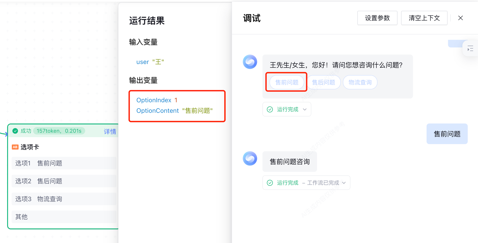 选项卡节点属于信息收集类节点,支持通过选项卡形式询问用户并收集信息,适合选项明确且数量少的情况。工作流执行至该处会中断与用户进行交互。