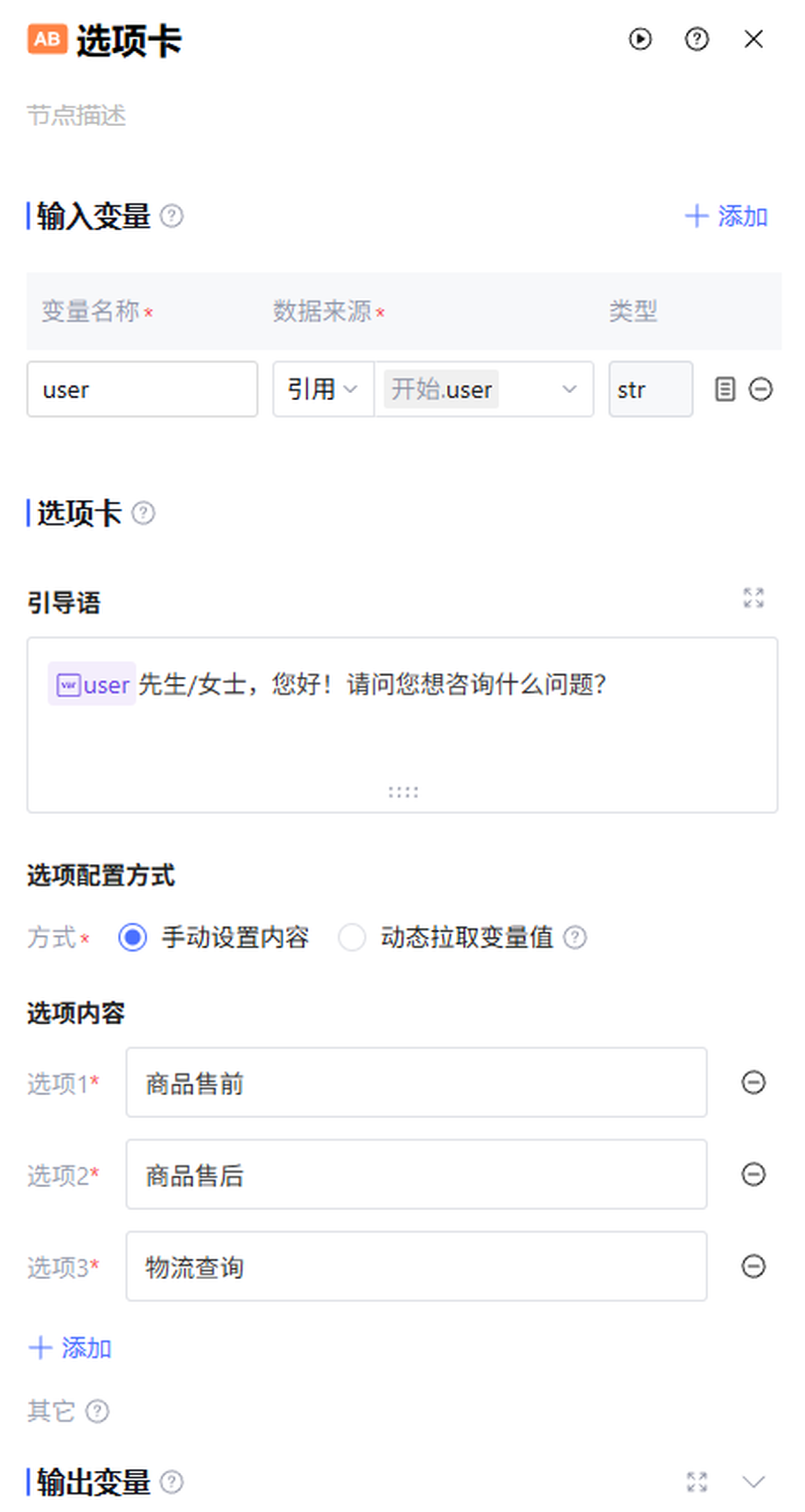 手动设置内容 | 在选项内容的输入框内输入固定选项,输入框支持通过输入"/"引用该节点的输入变量。最多可添加至20个选项。 |