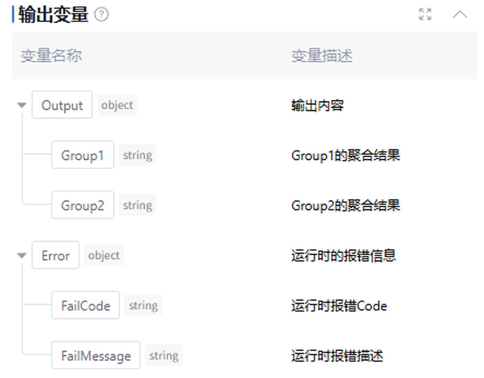 经该节点处理后的输出变量。默认为用户配置的 Group 组,输出每个 Group 聚合后的结果,以及运行时报错信息 Error(数据类型为 object,正常运行时该字段为空)。不支持用户手动新增。