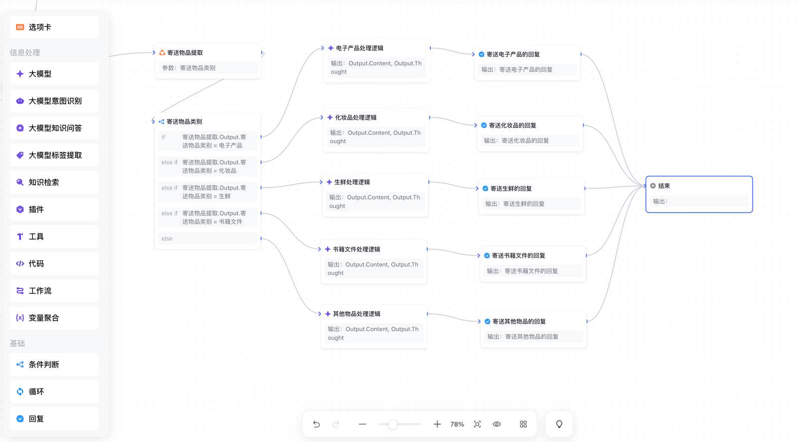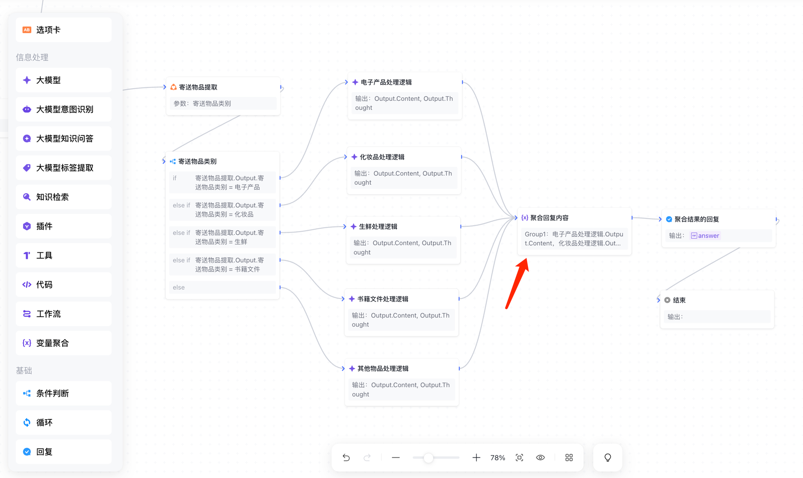 在"快递费用查询"场景中,根据寄送物品的不同,会走相应的工作流分支并执行特定逻辑,针对每一类物品处理后都需要连接回复节点输出处理结果,而使用变量聚合节点可以汇总每一条分支的处理结果,只需要输出变量聚合后的结果。